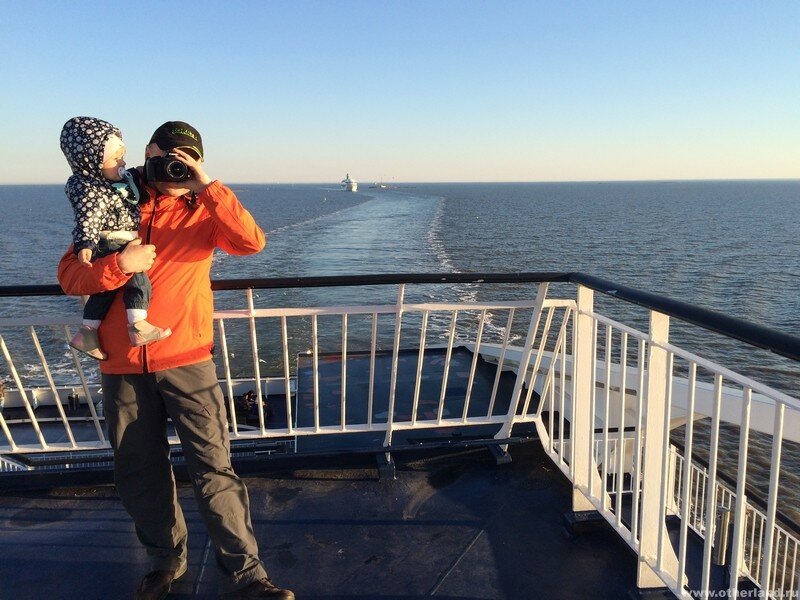 Показалась земля. Мы пошли на палубу сделать несколько снимков на память. Оказалось, что это не так просто. Ветер плюс ёрзающий ребёнок. Навести объектив непросто, какая уж там композиция: