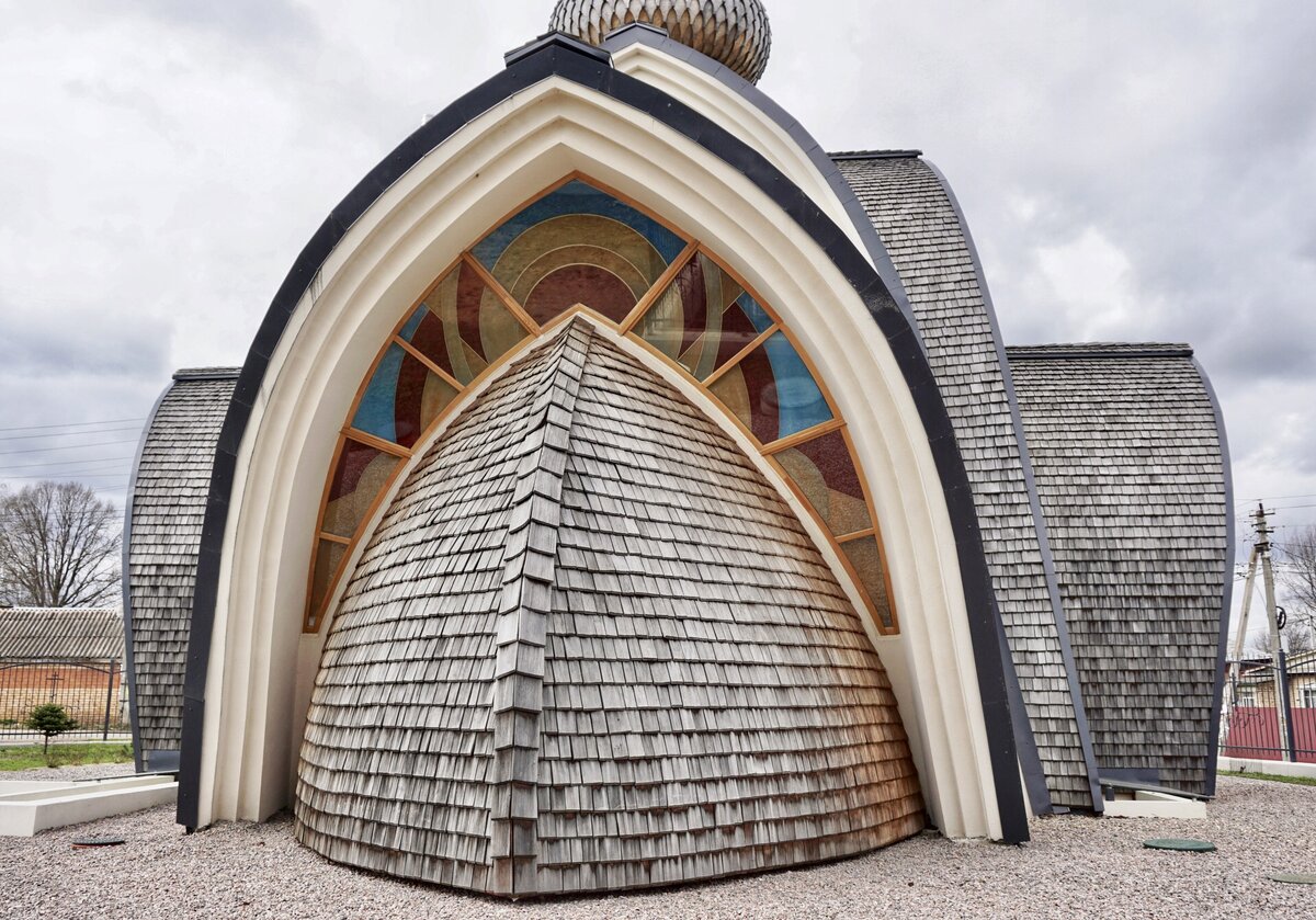 Хотя от строительства деревянной церкви решено было отказаться, дерево играет важнейшую декоративную функцию в архитектуре исаковского храма. Оно осталось в виде шинделя, покрывающего ниспадающую до уровня земли крышу. Он уже приобрёл интересный оттенок выцветшей древесины, знакомый каждому по неокрашенным деревенским сараям. Это я сейчас не иронизировал. Такое покрытие выглядит действительно круто и если всё сделать правильно будет весьма долговечным.