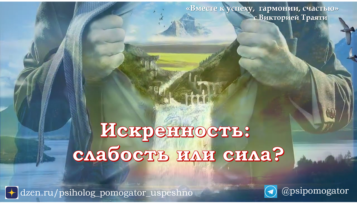 Это один из тех вопросов, который я очень часто слышу от моих клиентов - женщин и мужчин абсолютно разного возраста, начиная с юношеского и до самого зрелого, - когда прорабатываем вместе запросы в сфере отношений в паре между мужчиной и женщиной, в семье между близкими родственниками или рабочие отношения с коллегами (равными по статусу, подчиненными или вышестоящими руководителями). Многие считают, что проявление искренности человеком в процессе его общения/взаимодействия с другими людьми - это признак его слабости. Иной раз его искренность трактуется окружающими людьми даже как признак некоторой степени глупости или недалекости, и сопровождается эмоциональной окраской с оттенками презрения, снисходительности и осуждения. Прежде чем ответить на этот вопрос, давайте уточним - а что такое искренность? Предлагаю взять за основу вот такой вариант: ИСКРЕННОСТЬ - это внутренняя прозрачность, честность и открытость, отсутствие противоречий и полное соответствие в мыслях и помыслах, эмоциях