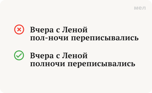 Правило слитного и дефисного написания слов, которые начинаются с «пол-», довольно простое, но запомнить его все равно не очень просто. Попробуем объяснить его еще раз. Правильно: полночи Сначала сразу ответ на вопрос — слово «полночи» пишется слитно, потому что вторая его часть начинается с согласной буквы и эта согласная буква — не «л». По такому же правилу пишутся: Это была первая, самая простая часть правила, которую мы на всякий случай повторим: Если вторая часть слова с «пол-» начинается на любую согласную, кроме «л», — слово пишется слитно Теперь вторая часть правила — дефисное написание слов, которые начинаются с «пол-». Через дефис пишутся слова, вторая часть которых: И традиционно несколько примеров для запоминания: Больше полезных карточек о русском языке — в «Грамотности» на «Меле» в Telegram. Подписывайтесь, чтобы говорить и писать правильно. Обложка: Vincent van Gogh / Puvlic domain