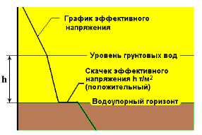 Скачок эффективного напряжения - следствие взвешивающего действия воды (архимедовых сил) и восприятия водоупорным слоем давления грунтовых вод (гидростатического давления). Эффективное напряжение грунта - напряжение, действующее в скелете грунта, равное разности между полным напряжением в образце грунта и давлением в поровой жидкости. Если на некоторой глубине ниже уровня водонасыщенных грунтов залегает водоупорный слой, то на его верхнюю границу действует вес столба воды и начиная от уровня грунтовых вод и до водоупорного горизонта объемный вес грунта на "уменьшается" из-за взвешивающего действия воды. На водоупорном горизонте (ниже которого грунтовая вода отсутствует) взвешивающий эффект воды исчезает, что создает скачок эффективного напряжения: (положительный) равный гидростатическому давлению на этой отметке, так как верхнюю границу водоупорного слоя действует вес столба воды. Если водонасыщенные грунты расположены над водоупором, то значения скачков