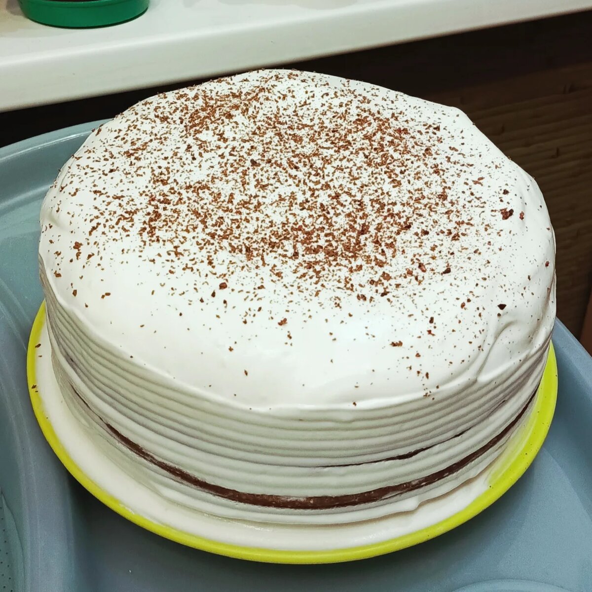 Старший сын у меня сейчас на больничном. Никогда так не болел. Всегда максимум три-четыре дня. А тут уже вторая неделя с температурой. Попросил что-нибудь вкусненькое. Думала испеку бисквит, как обычно (детям нравится с сушёной черникой или свежими яблоками). Потом решила, что будет тортик - в холодильнике стояла пачка сметаны - можно крем сделать. Залезла в интернет и нашла новый рецепт сметанно-сливочного крема. Пришлось мужа в магазин отправить за сливками для крема и бананами для начинки. Торт получился большим и очень вкусным. Крем это нечто - воздушное облако со сливочным вкусом. Рецепт, я конечно, нарушила. Там было так: 600 гр. сметаны отвешенной (в сито кладём марлю, на нее сметану и ждём часа 4 пока стечет сыворотка) 300 гр. холодных сливок (жирностью от 30%) 250 гр. сахарной пудры Все ингредиенты сначала аккуратно перемешать, а потом взбить миксером. Сметану я отвесила - часа 2 не больше. Сметаны у меня было меньше (300 гр), а сливок больше (500 гр). Пудры взяла 2 пакетика п