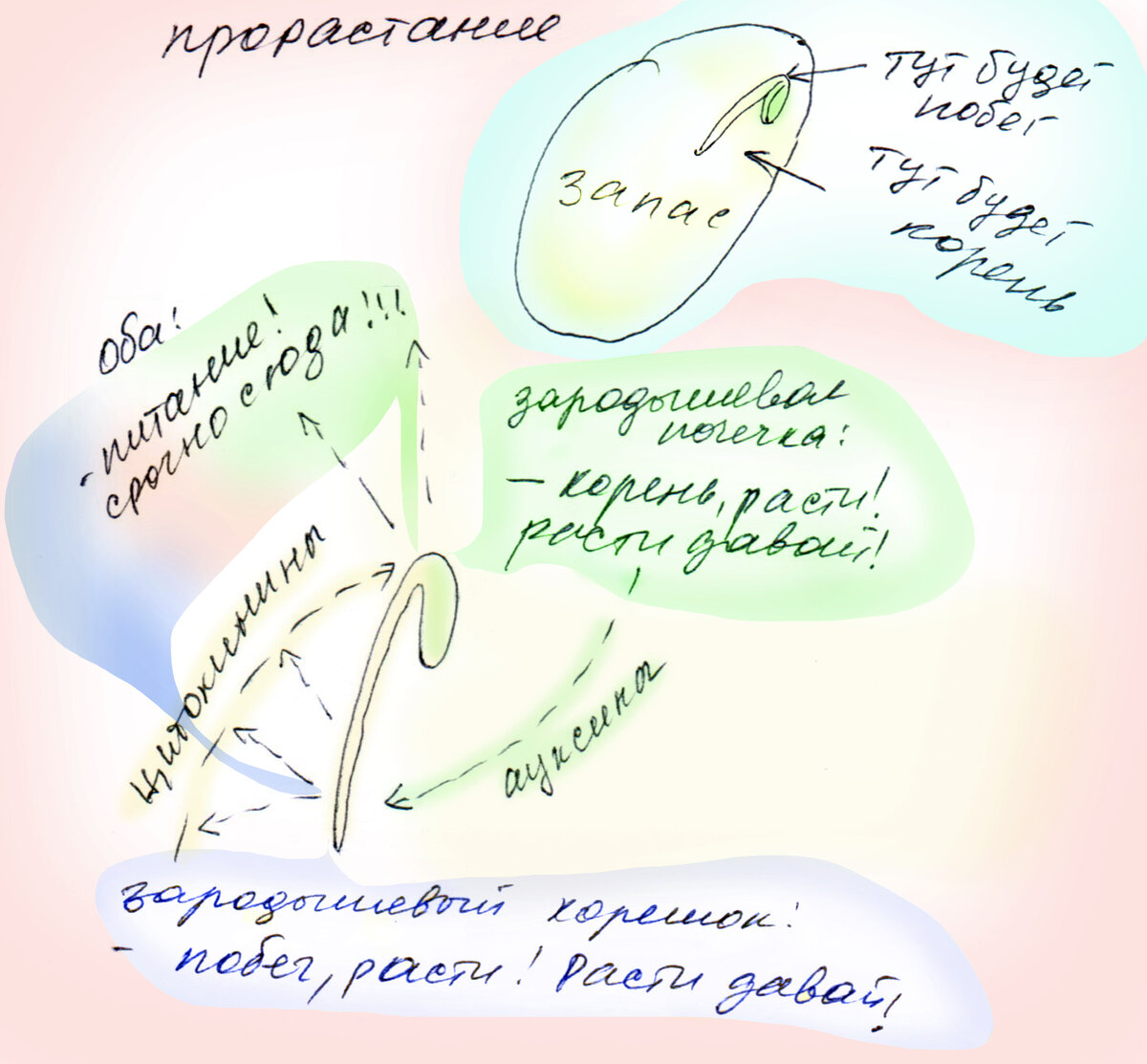 Как только прорастание началось, крошка-проросток начинает производить гормоны. Зародышевая почечка - ауксины, а зародышевый корешок - цитокинины.