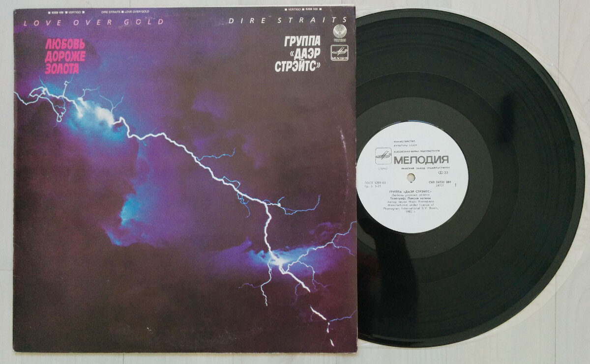Dire Straits - 82 "Love Over Gold" Заканчивался 1986 год, советские люди заражались предновогодней лихорадкой, когда надо было украсить стол дефицитными продуктами. А нас,школьников, повезли в райцентр для постановки на воинский учёт в военкомат. Это важное событие для каждого пацана, ты действительно становишься взрослым, тебя ждёт армейская служба. Процедура заняла больше времени, чем мы думали. Мы с одноклассниками управились быстро и пошли по ближайшим магазинам. Один из них назывался Турист и торговал спорт и музыкальными товарами. Конечно,взгляд начинающего меломана-коллекционера зацепил полку с винилом. Выбор был не очень велик,даже для районного центра, но одна меня зацепила классной обложкой с молнией. Что это за Dire Straits никто не знал, но я решил всё-таки её купить. Разглядывал по дороге состав,удивлялся наличию контрабаса и боялся что это какой-нибудь нелюбимый мною джаз. Честно сказать музыка Марка Нофлера тогда не произвела на меня- подростка такое уж неизгладимое в