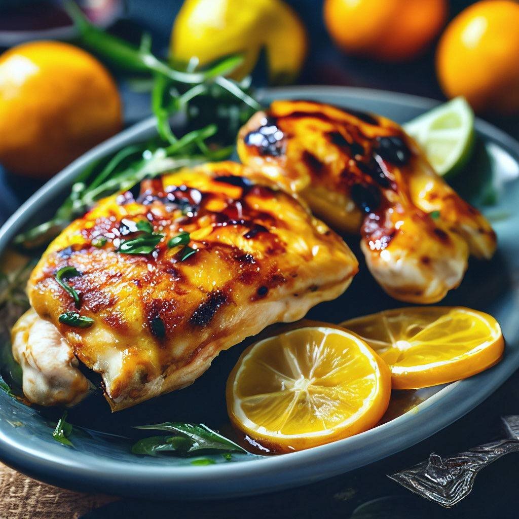 2. Смешать, обмазать. Сделать в мясе глубокие надрезы и поместить в них кольца апельсина. Мариновать минут 30, или оставить на ночь.