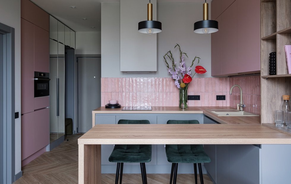 Алена Матисова создала «розовый» интерьер, который смотрится современно, элегантно и очень стильно Место: Москва Метраж: 34 кв. м Год реализации: 2023 Комнаты: 2 Cанузлы: 1 Высота потолков: 3 м Бюджет: 3 млн рублей Дизайн: Алена Матисова Стилист: Мари Воробьева Фото: Евгений Гнесин Проект небольшой евродвушки 34 кв. м создавался для молодой девушки-врача. Заказчица любит розовый цвет и хотела применить его в интерьере. У дизайнера Алены Матисовой были большие опасения, что квартира с такими оттенками будет выглядеть немного инфантильной, поэтому основная задача была сделать нежный, женственный интерьер, но функциональный и благородный. Изначально квартира сдавалась без внутренних перегородок. Во время ремонта выделили общественную зону кухни-гостиной и приватную зону спальни с гардеробной. Просьбой заказчицы было сделать именно изолированную спальню и использовать барную стойку вместо стола. Для визуального расширения кухни-гостиной убрали перегородку между прихожей и перенесли встроен