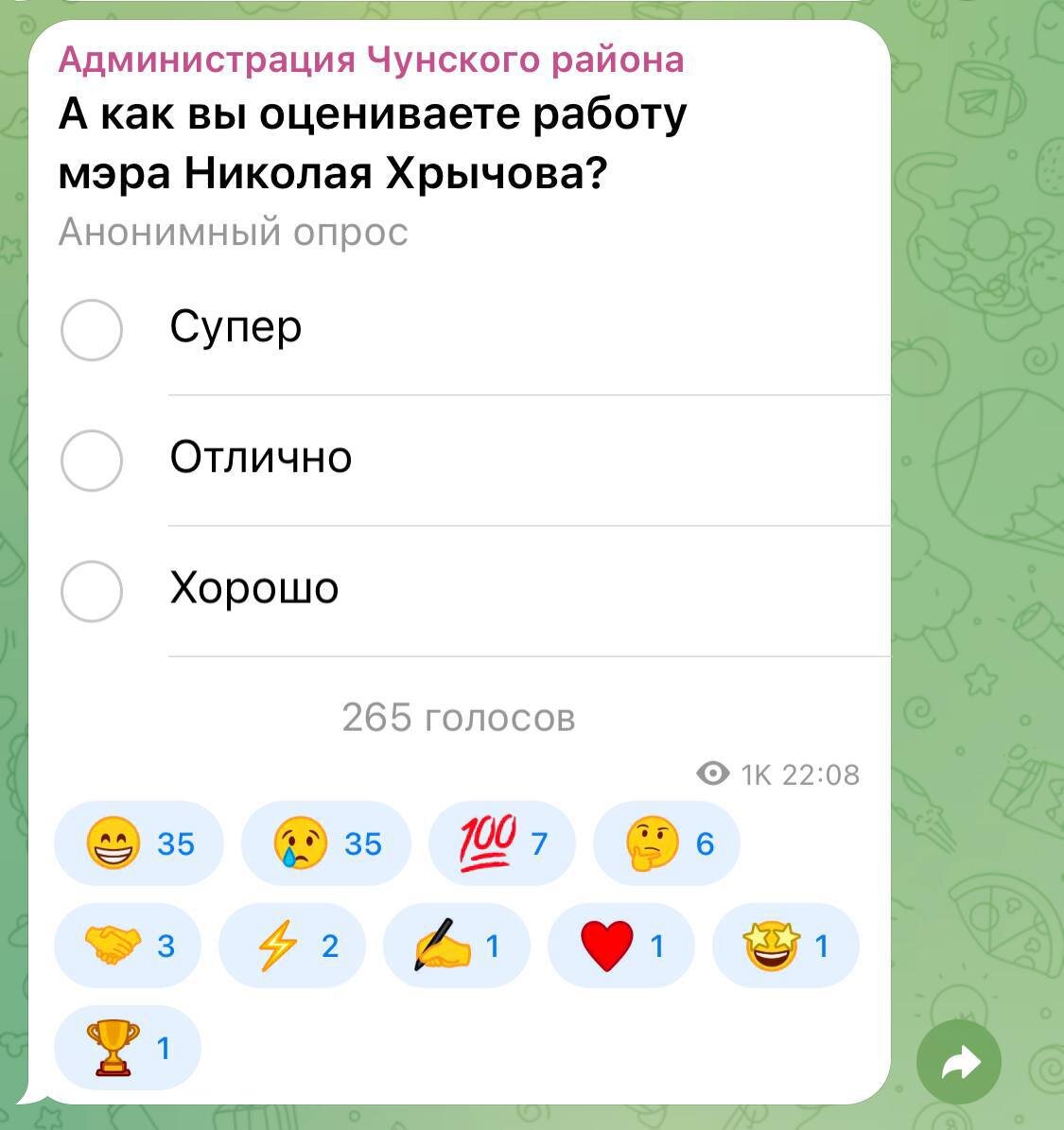 Анекдот: мэр Чунского района Иркутской области решил узнать, как граждане оценивают его работу. Но по какой-то причине варианта с негативным отзывом в Телеграм-канал администрации не завезли.