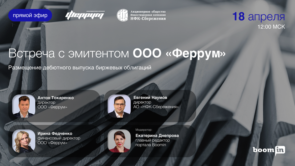 В рамках онлайн-встречи с инвесторами, которая пройдет в четверг, 18 апреля, на YouTube-канале Boomin, представители компании расскажут о результатах работы в 2023 г., а также о размещении дебютного выпуска биржевых облигаций. Прямой эфир с директором ООО «Феррум» Антоном Токаренко и финансовым директором компании Ириной Федченко состоится 18 апреля в 12:00 по московскому времени на YouTube-канале Boomin. В мероприятии также примет участие директор АО «НФК-Сбережения» (организатор размещения выпуска) Евгений Наумов. Модератором выступит главный редактор портала Boomin Екатерина Днепрова. Онлайн-встреча посвящена итогам работы ООО «Феррум» — нижегородской компании, специализирующейся на обработке и поставке металлопроката для судостроения и судоремонта, — а также размещению дебютных биржевых облигаций. Пятилетний выпуск серии БО-01-001P объемом 250 млн рублей доступен для покупки как на первичном, так и на вторичном рынках. Последняя установленная ставка купона (13-й купонный период) —2