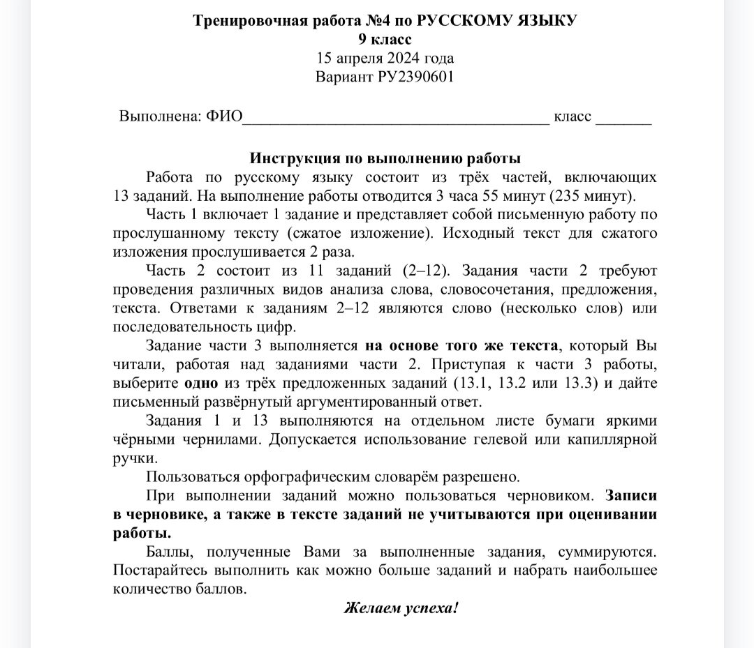 15.04.24 проходит работа СтатГрад - русский язык. 9 класс. Вариант РЯ2390601 Часть 1 Прослушайте текст и выполните задание 1. Сначала напишите номер задания, а затем текст сжатого изложения. Сжатое изложение напишите от того же лица, от которого ведётся повествование в исходном тексте. Прослушайте текст и напишите сжатое изложение. ➡️РЕАЛЬНЫЕ ЗАДАНИЯ И ОТВЕТЫ УЖЕ У НАС В ТЕЛЕГРАМ Учтите, что Вы должны передать главное содержание как каждой микротемы, так и всего текста в целом. Объём изложения не менее 70 слов. Пишите изложение аккуратно, разборчивым почерком. Часть 2 Ответами к заданиям 2-12 являются слово (несколько слов) или последовательность цифр. Ответ запишите в поле ответа в тексте работы. 1.Прочитайте текст и выполните задания 2-4. (1)Исследователи, изучающие особенности древнерусской литературы, не раз указывали на то, что в разных произведениях близкие по содержанию эпизоды передаются одним и тем же способом: с помощью тех же литературных приёмов, одних и тех же слов. (2) Т