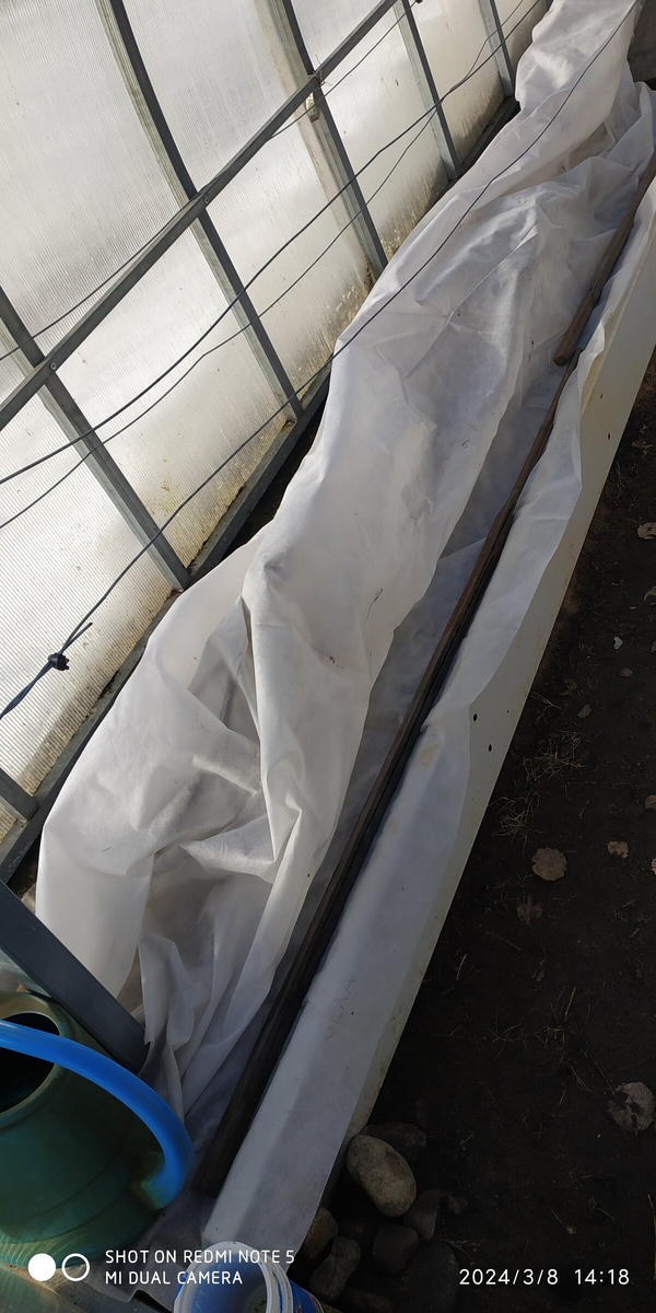 В субботу снял укрытие с винограда. Укрытие каждый год снимаю в разное время, учитывая дневную и ночную температуру. Пока почки винограда находятся в спящем состоянии, они способны переносить заморозки до –4 градусов Цельсия. Однако, если почка уже пробудилась, она точно погибнет даже при незначительном морозе в –1 градус. Поэтому весной нужно ориентироваться на прогноз погоды, чтобы не смёрзли почки. Наиболее благоприятные условия наступают, когда дневная температура воздуха достигает значения в 8-10 градусов тепла, а ночная – не опускается ниже нуля. В теплицах сейчас днем уже достаточно тепло. Теплицы у меня оборудованы термоприводами с автоматическим открыванием для проветривания. И днем форточки открываются. Нельзя и пропустить момент открытия винограда, если запоздать лоза может сопреть. Сразу укрытие я не снимаю. Неделю назад открыл торцы укрытия и убрал доски с боков, чтобы лоза проветрилась и просохла. Нетканый материал пока на хранение не стал убирать, при риске снижения темп