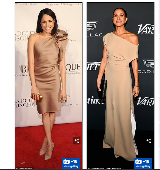 Ранее, в 2013 году, Меган надела платье Lanvin на одно плечо аналогичного карамельного оттенка на гала-концерт в Американском театре балета.