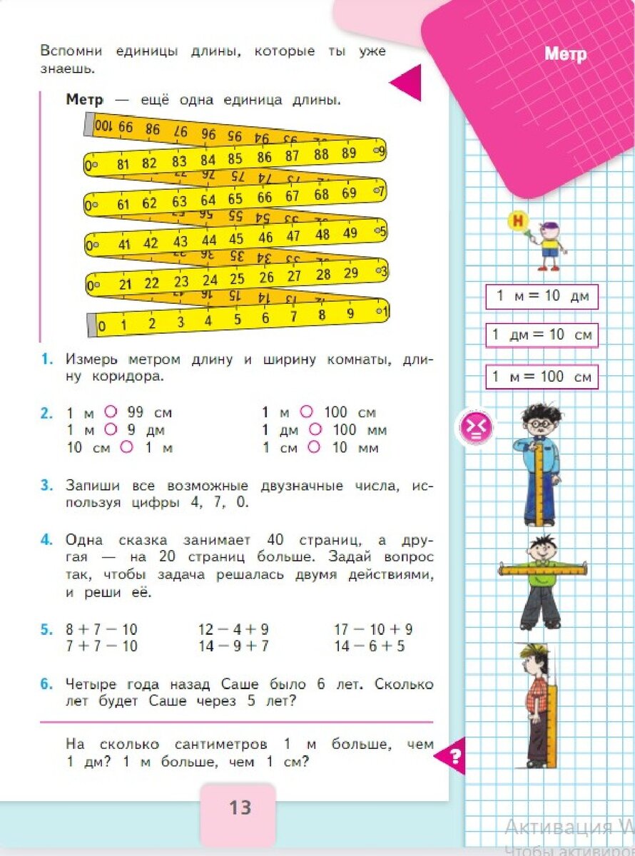 Знакомство с метром дается в процессе изучения первого десятка в связи с решением задач. В задачах нередко встречается слово “метр”: “купили 5 метров материи”, “длина класса 8 метров” и т. д. Чтобы учащиеся вполне осмысленно относились к этому понятию, нужно дать детям наглядное знакомство с метром и поупражнять их в измерении метром. Знакомство с метром производится следующим образом: Упражнения в измерении бывают двоякого рода: Всякое полученное при измерении число записывается, например: 8 метров, 5 метров и т. д. Но вскоре после ознакомления с метром (на третьем-четвертом уроке) учитель показывает ученикам сокращенную запись слова “метр” одной буквой м без точки: 8 м, 5 м, 3 м и т. д. Можно давать измерительные работы в качестве домашнего задания: измерить длину и ширину своей комнаты, своей кровати и др. В таком же плане дается ознакомление с сантиметром.