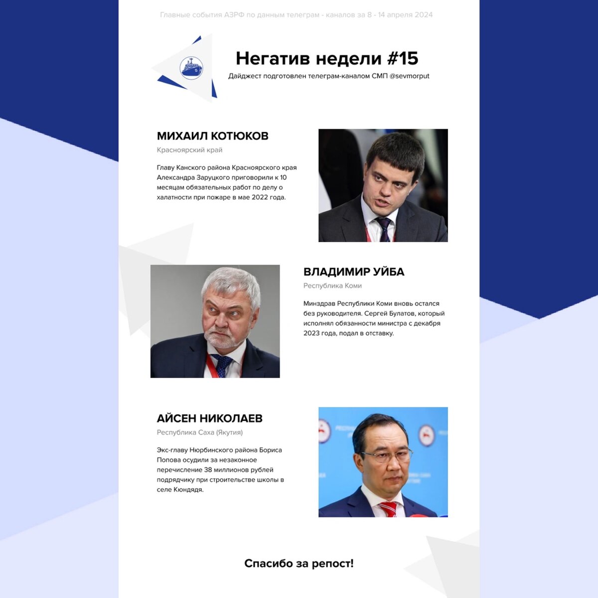 Представляем еженедельный рейтинг «Главы АЗРФ — Негатив недели. Неделя 15» Михаил Котюков Главу Канского района Красноярского края Александра Заруцкого приговорили к 10 месяцам обязательных работ по делу о халатности при пожаре в мае 2022 года. В мае 2021 — мае 2022 года Заруцкий не принял меры по ликвидации несанкционированной свалки на площади 28 тыс. кв. м, на которой загорелись горючие материалы, и огонь распространился на лесные насаждения на площади 400 га и 10 садовых домов. В результате халатности чиновника муниципалитету был причинен ущерб на 914 тыс. рублей, а жители понесли убытки на 4 млн рублей. Владимир Уйба Минздрав Республики Коми вновь остался без руководителя. Очередной министр здравоохранения Коми Сергей Булатов, который исполнял свои обязанности с декабря 2023 года, подал в отставку. В команде Владимира Уйбы он стал шестым министром здравоохранения, оставившим пост. Очевидно, отсутствие постоянного руководителя негати