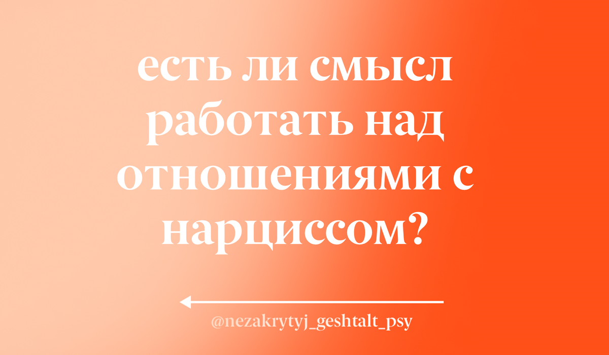 Если вас не устраивают в отношениях чьи-то черты характера, базовые проявления и способы адаптации, то не стоит лукавить и подменять понятия "работаем над отношениями" и "я жду пока человек вдруг станет другим". Меняются ли люди? Я убеждена, что да. Но только при одном условии - они это делают для себя и из личной потребности. Ну и прикладывают усилия. Много усилий. Это процесс. Я не знаю, как можно работать над отношениями с нарциссом. Ну типо он и так не удосужился воспринять, что вы не его мама беспрестанно дающая, а тут еще такое подкрепление а-ля "ради тебя я готова на все, и даже оставаться, и даже работать.... над отношениями". Ну и чего. Нарцисс конечно одобрит эту затею, вы не сомневайтесь. Только конечно он решит, что вам действительно требуется поработать и над отношениями, и над собой... И вообще он никогда не сомневался, что вам бы следовало поработать, чтоб стать лучше... для него. А он... Ну чего он. Ясно же, что он как раз в каждую секунду своей жизни являет собой иде
