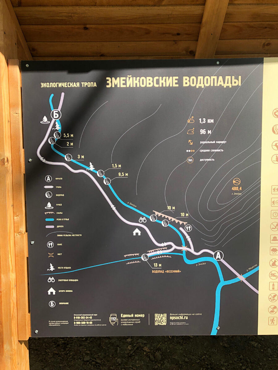 В Сочи отлично развит общественный транспорт и хорошие дороги. И ещё очень красивая природа, горы, реки и водопады. Если есть свой автомобиль - прекрасно, можно путешествовать без трат на экскурсии. Если нет нет - тоже не беда, иногда на экскурсию можно съездить на городском автобусе. Итак, я отправляюсь на Змейковские водопады. Автобусом номер 120 нужно доехать до остановки «Водопады», немного пройти пешком, спускаясь с горы, и вот она КПП. Все! Вы на месте! Автобус идет от вокзала со всеми остановками. Вход в Сочинский национальный парк стоит всего 200 рублей, терминал есть. Стоимость проезда в Сочи в апреле 2024 года - 40 рублей. Итого на самостоятельную экскурсию вы потратите 280 рублей! Итак, заходите на территорию и просто идете по дорожкам, направления обозначены. Устали - есть оборудованные места отдыха. Территория небольшая, за пару часов обойдете всю, поэтому не спешите. Наслаждайтесь. Недалеко от входа есть кафе и даже баня. Идите туда, там первый водопад. Я была в