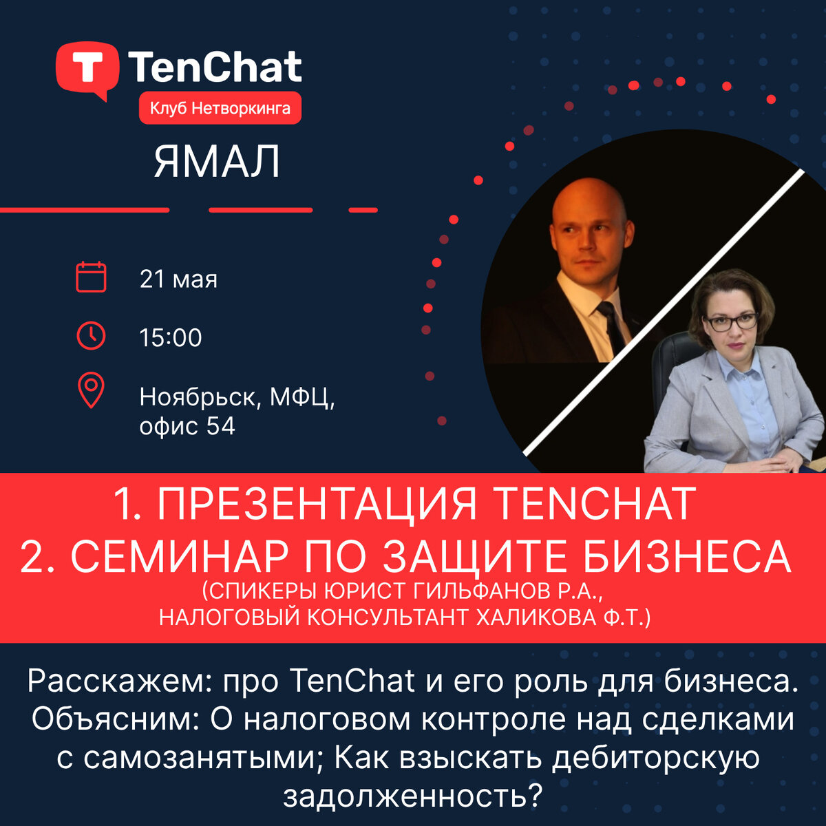 Индивидуальные предприниматели, руководители организаций и их участники, то есть бизнесмены, часто в своей предпринимательской деятельности несут повышенные риски, связанные как с бизнесом, так и с личным имуществом. Ошибки совершаются из-за отсутствия информированности по юридическим вопросам ведения бизнеса. А для получения юридической защиты бизнеса, как правило, требуются дополнительные финансовые затраты для оплаты этих услуг специалистам. В условиях нынешней экономической реальности предприниматели затраты сводят к минимальным, не обращаясь за платной юридической поддержкой бизнеса. Например, в Ноябрьске, да и вообще на Ямале, предприниматель, либо представитель бизнеса, может получить такую юридическую помощь бесплатно. Юридическая консультация бесплатно оказывается для участников Ямал Клуба Нетворкинга TenChat. Все участники Ямал Клуба Нетворкинга TenChat это по сути друзья, которые встречаются и обсуждают различные вопросы, обмениваются опытом, в том числе получают на семинар