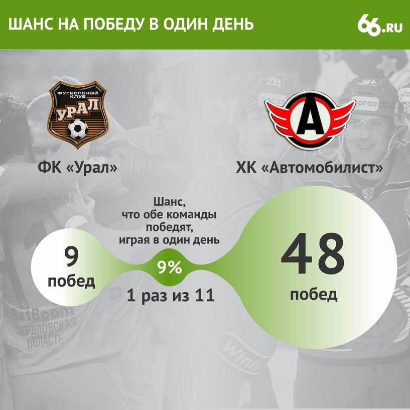 В сезоне 2023/2024 ФК «Урал» победил девять раз в матчах Российской Премьер-лиги (РПЛ) и Кубка России: из них больше половины (пять) — в июле-августе, когда ХК «Автомобилист» еще не начал свой успешный сезон. Всю осень — сентябрь-ноябрь — «Автомобилист» выдавал победные серии, в то время как у «Урала» случился жесткий спад, клуб выиграл лишь два матча. По итогу сезона клубы имеют противоположные результаты: «Автомобилист» занял третье место, «Урал» к концовке расположился на третьем месте с конца турнирной таблицы, в зоне стыковых матчей на вылет из РПЛ. Как показал наш анализ, если обе команды играют в один день, то с большей долей вероятности проиграют оба клуба. Шанс, что «Урал» и «Автомобилист» возьмут очки в своих турнирах, — 9%. Во всех правилах есть исключения. В календаре есть единственная памятная дата, когда обе команды побеждали в один день, — 3 октября.