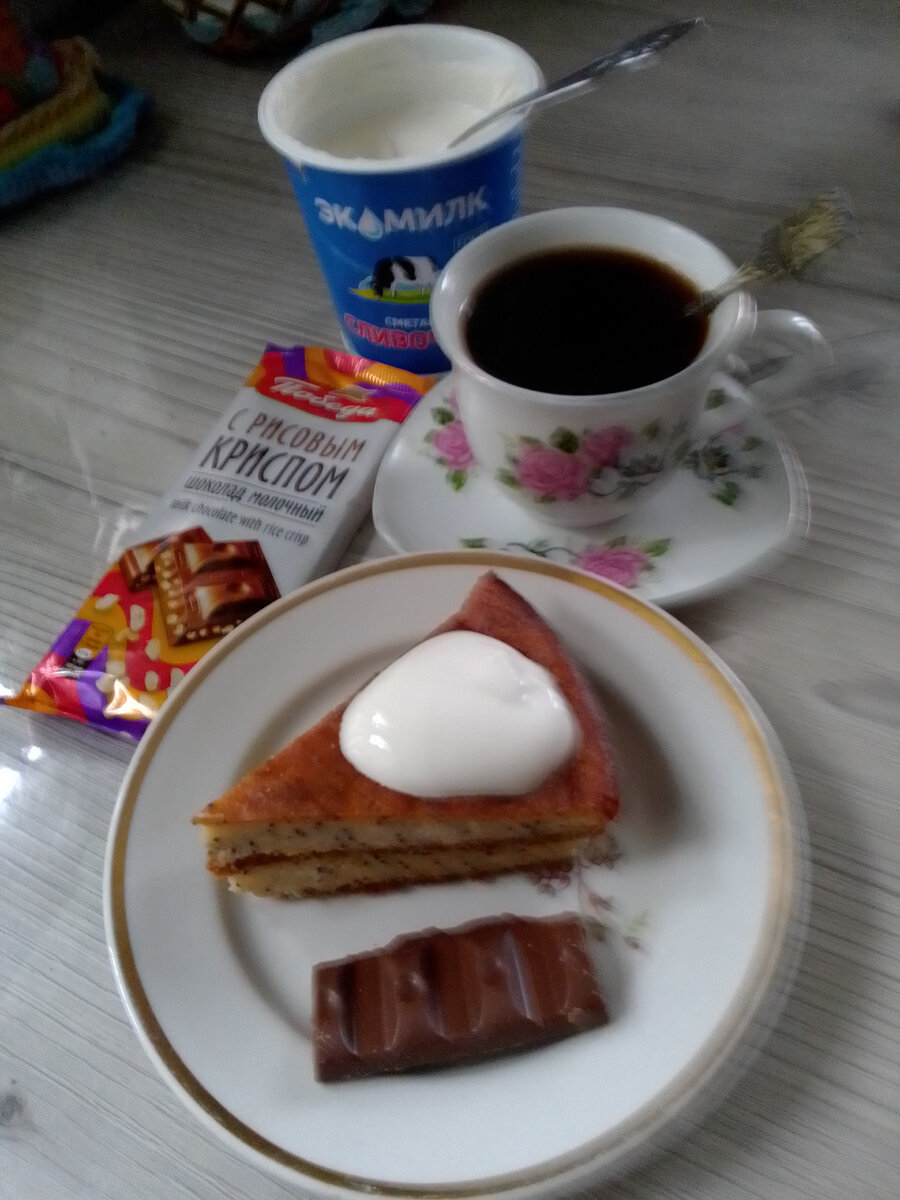 Добрый день, дорогие мои подписчики и гости моего канала. С вами Надежда. Я приглашаю вас на свою кухню, где покажу вам экономное меню на день на семью из двух человек. Проснулась как обычно, зазвенел будильник на телефоне, отключила и снова спать, встала уже в 8:30. Завтрак готовить не надо, так как есть творожная запеканка с маком, которую я делала вчера. Завтрак – творожная запеканка с маком, ели ее со сметаной экомилк, которую я купила во вторник, срок хранения до 11 мая, а также я пила черный растворимый кофе без сахара с долькой молочного шоколада с рисовым крипсом марки Победа, муж пил чай. Планы на сегодняшний день были большие, хотя и болит спина, но погода внесла в мой план свои коррективы: температура всего + 6, и моросит дождь как из сита. После завтрака занялась уборкой в доме, на обед будет картофель отварной с селедкой, которую засолил муж несколько дней назад, на ужин задумала сделать жареные пирожки с капустой, достала тесто из морозилки, пусть размораживается. Итак о