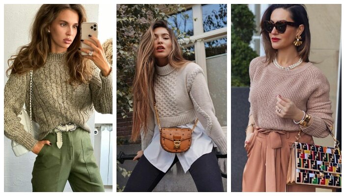 Весной не следует скрывать свитера в шкафу. Их можно успешно сочетать с базовым весенним гардеробом. Вот вам яркий пример идеального свитера на весенний сезон. Этот образ выглядит привлекательным, благодаря открытому плетению и яркому благородному оттенку. Колоритные оверсайз-свитера можно с уверенностью назвать трендом этого сезона, который гармонично сочетается с белыми рубашками, яркими юбками или брюками, а также золотыми цепями. Ярко-розовый свитер с круглой горловиной в минималистичном стиле + белая рубашка + розовые брюки классического кроя — запоминающийся аутфит, с актуальной моделью свитера. Также весной 2024 года стилисты предлагают нам составлять повседневные или же праздничные луки с укороченными яркими свитерами с ажурной вязкой или контрастной вышивкой. Перед вами образ, как раз с таким свитером, его стилисты дополнили кожаными широкими брюками и замшевым клатчем с золотой цепочкой. Укороченный свитер с объемными воланами в области груди — еще ода идеальная модель, котор