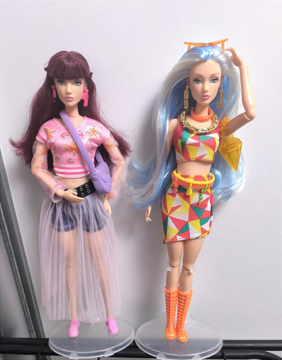 Всем привет, наконец у меня появилось желание обратить свой взор на двух девчонок, которые поселились уже давненько. Одну я периодически переодевала, вторую вообще не трогала, потому что и так нравится. Вот и они: Первая это Мишель, такая немного спортивная девчонка. А вторая Дафна (оранжевая), которую я купила первой и скажу сразу, что она моя фаворитка. Вот только удачнее на фото мне кажется получилась всё таки Мишель :) Возможно, я ошибаюсь. Итак, Дафна. Богатая, но очень молодая девушка, явно любит блеск золота и гламурные образы. Кстати, об образе. Её оригинальные сандалии конечно кхм "моё почтение"... Ощущение. Что ни одна одежда с ними не будет сочетаться, кроме её наряда. Думала ей прикупить какое-нибудь золотое платье, но вот что делать с обувью я без понятия, ведь искать туфельки или босоножки на плоскую стопу это жесть😐 Кстати многие в отзывах к этой кукле (да и по фото людей видно) писали, что у этой мадам часто вмятина от очков. Потому что в коробке она именно в них была