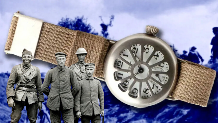 Наручные часы изобрели не военные, но они сделали их массовым явлением. До начала Первой мировой войны мужчины носили только карманные часы. Наручные часы назывались «часами на браслете», и считались женским вариантом часов. Понятно, что ни один мужчина не мог надеть «женские» часы. Это было стыдно. Но всё изменила война. Как правило, офицеры во время наступления в одной руке держали пистолет, а в другой руке свисток, с помощью которого они отдавали команды. Пользоваться часами в этот момент они не могли. Это было неудобно, и офицеры приматывали карманные часы к запястью с помощью лоскутов из кожи. Часовые компании обратили на это внимание и выпустили так называемые тренч-часы для военных. Это были те же самые карманные часы, но с наваренными по краям ушками. Для того, чтобы посмотреть время, по-прежнему приходилось открывать крышку часов, что было неудобно в бою. Тренч-часы делали с эмалированным циферблатом, широкими белыми цифрами и люминесцентной радиевой часовой стрелкой. В окопно