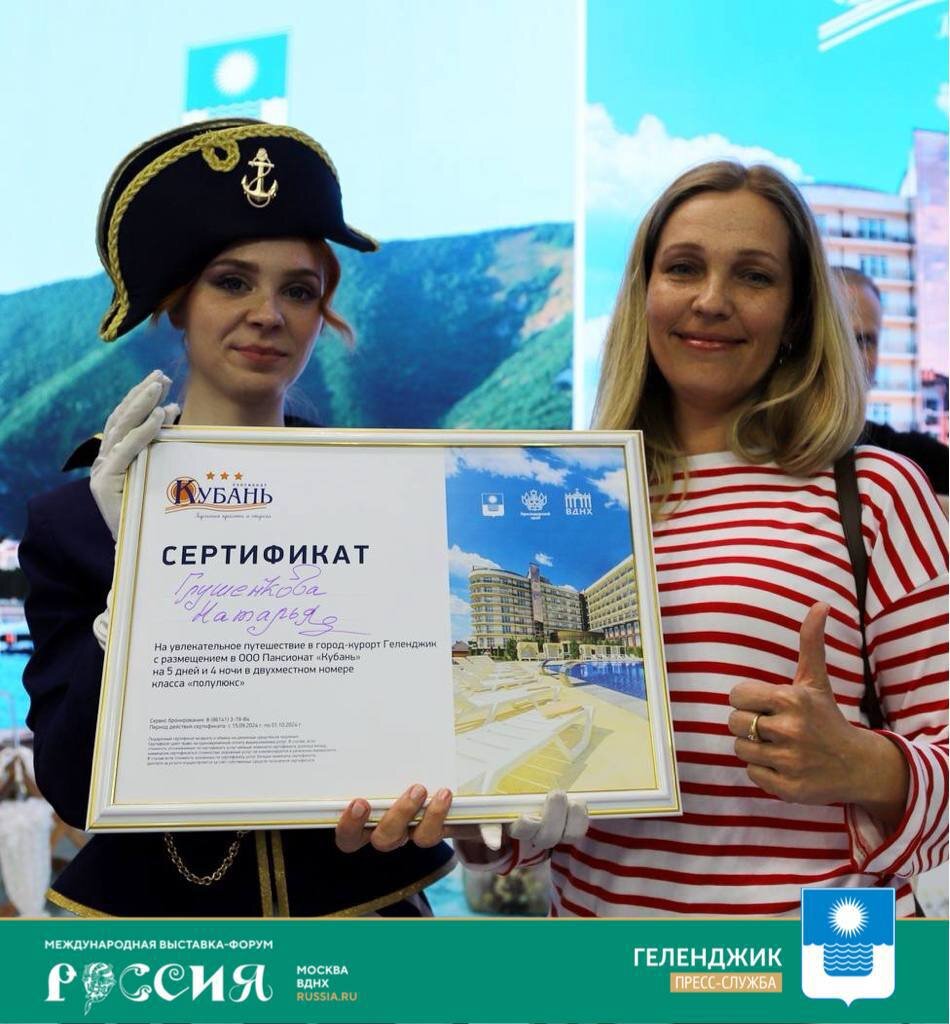 Путешествие на пять дней и четыре ночи на двоих в пансионате «Кубань» в лотерею выиграла москвичка Наталья Глушенкова. Она случайно сегодня оказалась на выставке «Россия» - у детей отменили уроки, и семья решила полезно и интересно провести время. И не прогадала! Теперь у Натальи есть планы на Бархатный сезон. Она проведет его в самом лучшем городе - Геленджике! Завтра - второй день Геленджика на стенде Краснодарского края (N75). В течение дня с 10.00 до 22.00 будут разыграны еще пять путевок. Воспользуйтесь шансом, приходите к нам на ВДНХ.