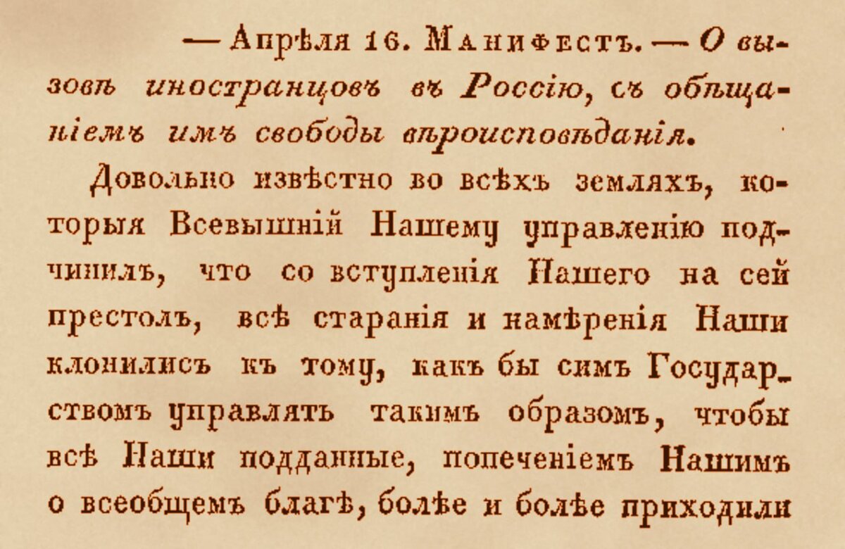 Первый документ регламентирующий трудовую миграцию, был принят 27 апреля (16 апреля по старому стилю) 1702 года. Это Манифест «О вызове иностранцев в Россию, с обещанием им свободы вероисповедания», подписанный Петром I. Процентов 60 документа – разъяснение мотивов, подвигнувших принять Манифест. Ещё процентов 10 – самый настоящий самопиар: «все старания и намерения Наши клонились к тому, как бы сим Государством управлять таким образом, чтобы все Наши подданные, попечением Нашим о всеобщем благе, более и более приходили в лучшее и благополучнейшее состояние» и подобное. Остальная часть – 4 пункта: 1. Иностранцев, едущих в Россию для поступления в армию, принимать как родных и бесплатно везти в столицу. 2. «Совести человеческой приневоливать не желаем и охотно предоставляем каждому на его ответственность пещись о блаженстве души своей». Также разрешены проповеди, домашние собрания верующих и даже строительство храмов. 3. Дабы иноземцы не пугались суровых российских законов, ввести для н