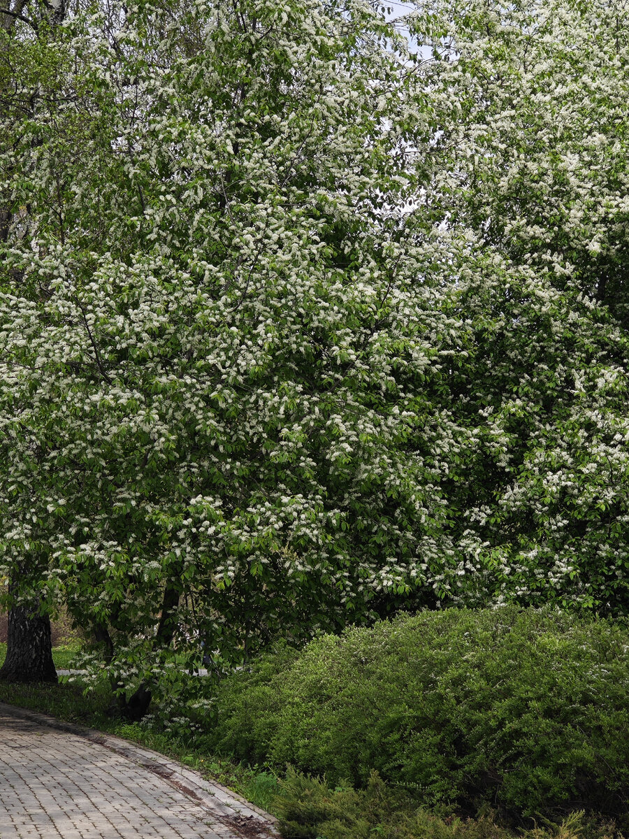 До цветения этого кустарника ещё около месяца, а пока при входе встречает такая шикарная черемуха.
