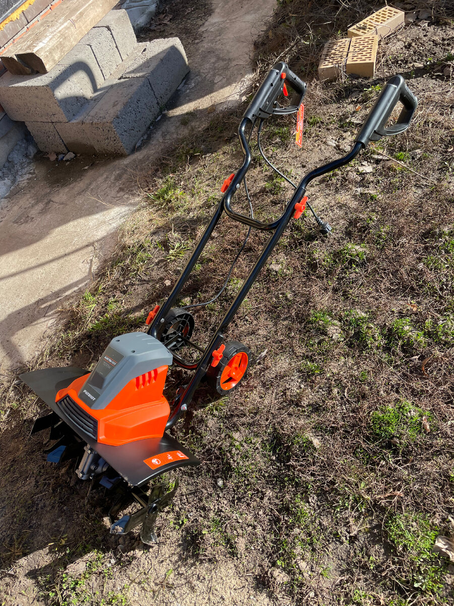 В моём списке желаний данный агрегат был на первом месте, я уже рассказывала. Запланировала эту покупку ещё в прошлом сезоне. Раз запланировала, надо взять. Выбрала по отзывам и конечно характеристики смотрела. Взяла самый, на мой взгляд оптимальный по цене и качеству. Писала как-то, что люблю электрическую технику, бензиновые меня пугают звуком и запахом. Для меня было ещё важно, чтобы культиватор был легким и компактным, чтобы можно было им копать грядки в теплице. Вообщем купила и уже опробовала. Надо конечно привыкать к нему. Включаешь его, он бежит вперед и копает поверхностно. Нужно как-то надавливать ногой. А ещё он очень сильно раскидывает землю, лучше работать с ним в сапогах, иначе полные галоши земли. И нужно обязательно следить за проводом, чтобы его не затянуло. А в целом, культиватор со своей задачей справляется. 2 грядки в теплице я перекопала за 10 минут Существенно экономит время и силы. Сын сегодня впервые попробовал поработать на нём - был в восторге. Перекопа