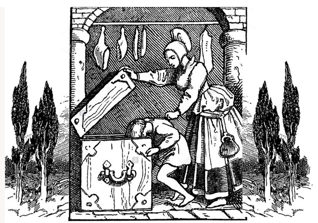 У мачехи был огромный сундук с массивной крышкой и большим железным замком, оснащенным острыми зубцами. Она заманивает мальчика в этот сундук под предлогом угощения, после чего захлопывает крышку и отсекает ему голову. Чтобы подозрения не пали на нее, она перевязывает шею мальчика платком, фиксируя голову на месте. Когда её дочь приходит домой и заговаривает с братом, тот ей не отвечает. Раздасованная, она ударяет его по уху, вследствие чего голова мальчика сваливается с плеч. Девочка, охваченная ужасом, бежит к матери и рассказывает о случившемся. Вместе они решают замести следы и готовят из тела мальчика… студень, который подают ничего не подозревающему отцу на ужин. Отец ест это блюдо с наслаждением. Девочка, убитая горем, собирает косточки брата и хоронит их под деревом в саду.