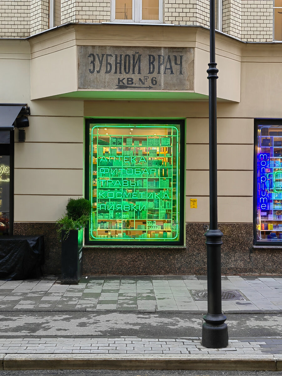 Не ожидал я, что в Москве так много старых вывесок, относительно недавно найденных на фасадах исторических зданий под более поздними слоями штукатурки. Сегодня вечером встретил еще одну. Точнее две на одном доме. Вывески "Аптека" и "Зубной врач" были обнаружены и восстановлены командой городских активистов "Вспомнить все" в 2012 и в 2016 годах. Реставрация уникальных находок - негосударственный проект, осуществленный на средства москвичей силами профессиональных реставраторов. Обе вывески выполнены на штукатурке стен дома в начале 1920-х годов. Под угловой вывеской проступает более старый предреволюционный номер (53) - заведение работало в этом доме с 1914 года. По всей видимости одно время оно входило в систему студенческих кооперативов, на что намекают надписи по левую и правую руку от вывески "Аптека". "Зубной врач" Сергей Борисович Капник принимал пациентов прямо у себя на дому в квартире номер 6 с 1922 по 1928 год. Адрес: Малая Бронная ул., д. 22 Координаты: 55.762805, 37.595048