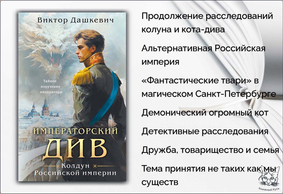 Вторая часть нашумевшего цикла о Колдуне Российской империи графе Аверином и его диве Кузе. О чём? В Петербурге исчезает несколько девушек, в это же время из-подо льда достают труп убитой дивы без головы. Человеческий закон до сих пор не запрещает мучить и убивать дивов, и граф Аверин сделает все, чтобы добиться справедливости. Вместе с Кузей он ищет связь между убийством и исчезновением девушек. Делом заинтересовался сам император Александр V. Но что, если его новое поручение поставит под угрозу жизнь Аверина и его близких? Мои впечатления. Книга по объёму меньше, чем первая часть, и я прочитала её буквально за два дня, погрузившись в увлекательные приключения Гермеса Аркадьевича и его друзей. И вот в объёме кроется главный недостаток лично для меня. Мне показалось, что события происходит уж слишком быстро, словно герои всё куда-то бежали и бежали, а потом — хоп! — и книга закончилась. Приятно было снова раскрыть вместе с графом Авериным отдельные мелкие преступления, а следом и одно