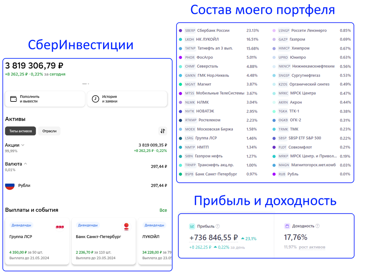 В данной статье покажу свой портфель, его стоимость, состав, доходность за 4 месяца 2024г и за весь срок моей инвестиционной деятельности. Мой портфель Инвестирую я больше 4х лет через брокера СБЕР, использую дивидендную стратегию и стоимость моего портфеля превышает 3.8 млн р!