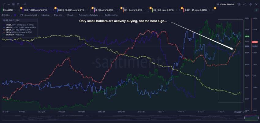 Понимание динамики рынка биткоина (BTC) крайне важно для инвесторов, особенно в контексте волатильных криптоактивов. Максим Балашевич, генеральный директор компании Santiment, представил свои мысли о текущей ситуации на рынке и подчеркнул, почему инвесторы должны проявлять особую осторожность после недавнего халвинга. Динамика рынка биткоина стала значительно более сложной. Исторически сложилось, что халвинг биткоина ассоциируется с ростом оптимизма на рынке и, следовательно, с повышением цен на криптоактивы. Однако Балашевич предпочитает применять более тонкий подход. "Вместо того чтобы просто отсчитывать дни после халвинга до следующего пика цен, опираясь на исторические данные (что является одним из самых распространенных методов анализа), или расчет процентного роста (что, вероятно, самый привлекательный вид анализа), мы задаем более сложные вопросы", - говорит он. Последние данные Santiment указывают на то, что различные группы держателей BTC следуют разным стратегиям. Крупные инв