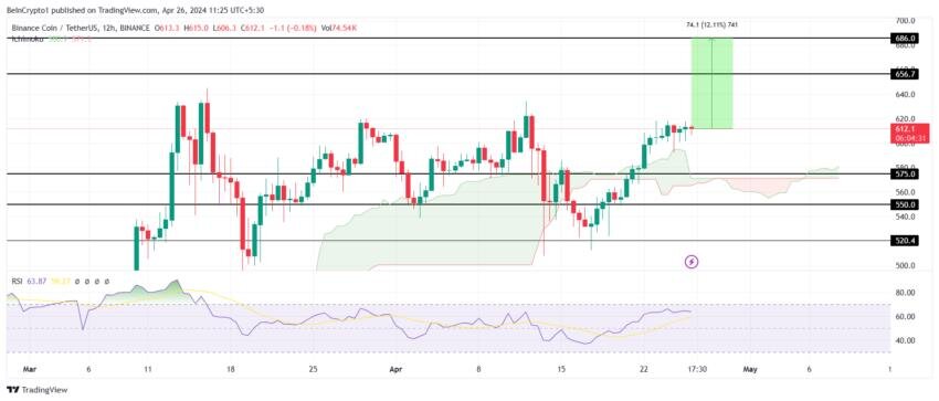 Участники крипторынка с нетерпением ожидают начала альтсезона, который традиционно наступает через некоторое время после халвинга биткоина (BTCUSD). Редакция BeInCrypto проанализировала криптовалюты, которые потенциально могут достичь новых исторических максимумов (ATH) уже в мае. BNB стремится побить рекорд трехлетней давности. BNB Coin, нативный токен крупнейшей в мире криптовалютной биржи Binance, пытается превзойти предыдущий ATH в $686. Последний раз BNB достигал таких уровней почти три года назад, в мае 2021 года. За последние два месяца цене не удалось преодолеть уровень сопротивления в $640, и на момент написания она составляла около $612. Однако, согласно индексу относительной силы (RSI), у альткоина есть потенциал для дальнейшего роста. Индекс RSI позволяет оценить перекупленность (выше 70) или перепроданность (ниже 30) актива, что помогает предсказать потенциальные изменения тренда. Пока BNB находится ниже зоны перекупленности, он может сохранять свой рост. Однако, существуе