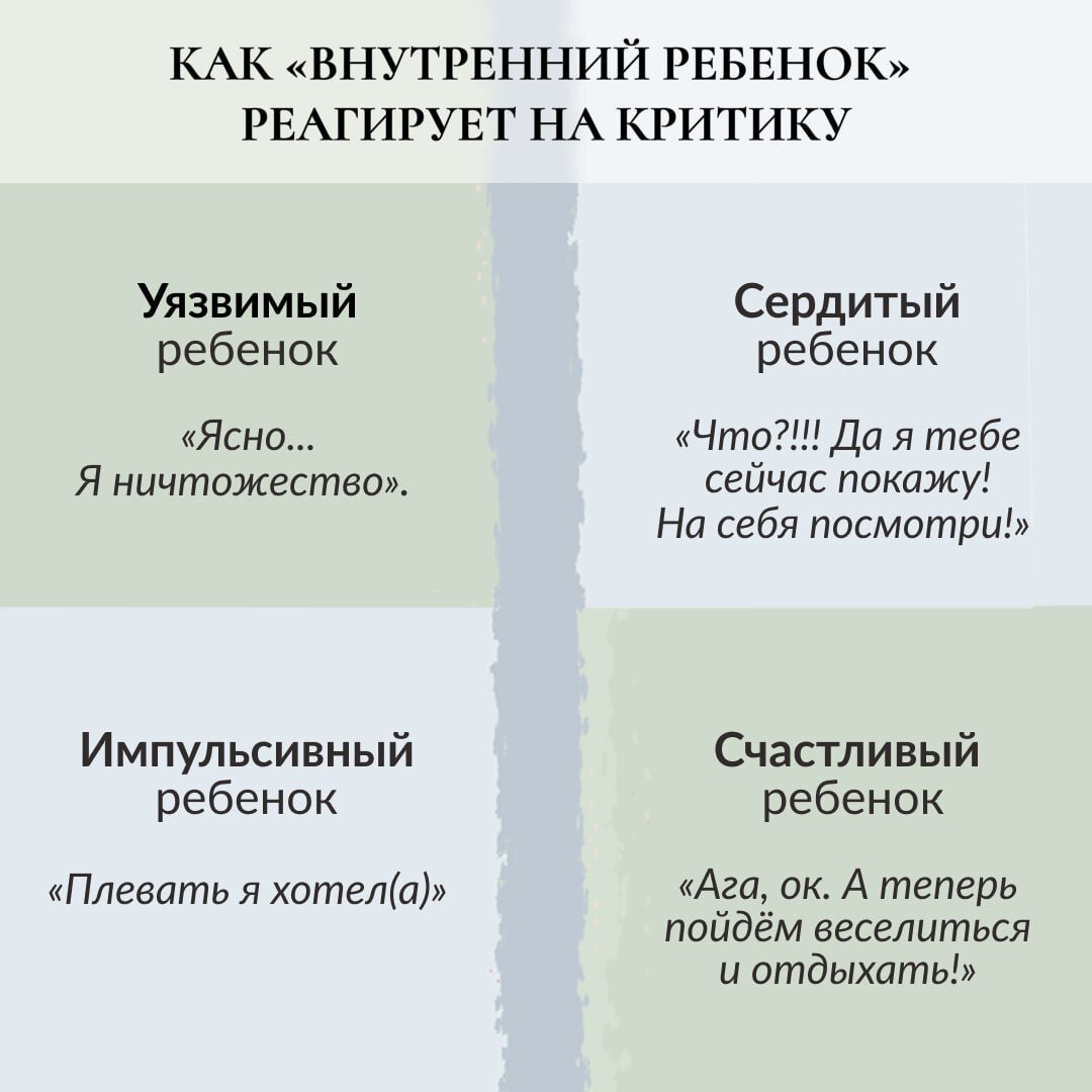 А родительская и детская значат, что взрослые люди иногда могут вести себя слишком требовательно, «по-родительски» или же «по-детски»: особенно это болезненно, когда начинают ощущать себя беспомощным, обиженным или разгневанным ребенком.