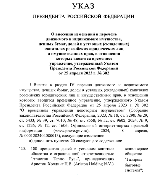Посла России уже вызвали в МИД Италии, где возмущены тем, что Россия национализирует Ariston Thermo Group, а в ЕС заявляют о нарушении международного права. Кому бы говорить о правах, а Россия просто ответила зеркально и руководствуется национальными интересами. Подробности происходящего - Путин подписал указ о передаче 100% активов Ariston и BSH Hausgerate Газпрому Указ подписан и опубликован 26 апреля, вступил в законную силу. Под управление "Газпром бытовые системы" переданы российские дочки крупных европейских компаний. Что получил Газпром? 100% акций ООО «Аристон термо Русь» принадлежащую итальянской корпорации Ariston Holding N.V. В России производят отопительное оборудование. 100% акций ООО «БСХ бытовые приборы» выпускающую бытовую технику, холодильники и стиральные машины под брендами Siemens и Bosch. Принадлежала немецкому концерну BSH Hausgerate GmbH Реакция последовала незамедлительно! ЕС призывает Россию отменить передачу активов Ariston и Bosch под управление Газпрома На с