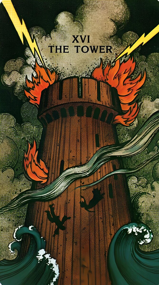 В рамках Аркана Башня в Таро, эта карта отражает глубокое чувство страха и потрясения, сопровождающее крах всех наших прежних убеждений, представлений и жизненной философии. Это ощущение может быть пугающим и даже ужасным, поскольку мы внезапно осознаем, что все наши прежние взгляды и стабильность рушатся прямо на наших глазах, оставляя лишь обломки.