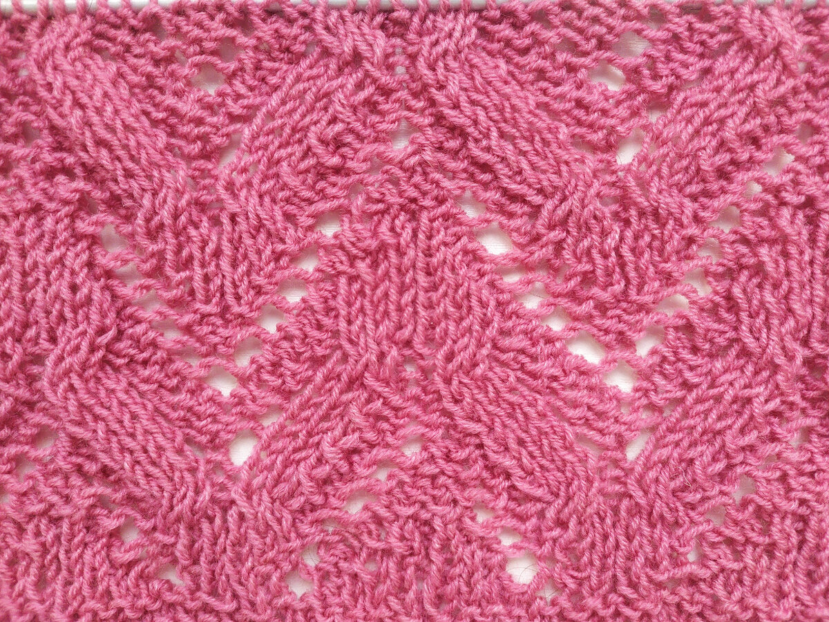 Таким узором будет хорошо смотреться удлинённый джемпер, связанный по незатейливой выкройке. Вяжется быстро и без каких-либо трудностей. Описание узора Раппорт узора состоит из 16 петель + 1 петля для симметрии + 2 кромочные петли. Изнаночные ряды вяжутся по рисунку, накид вяжется лицевой петлёй. Кромочные петли в начале ряда снимаются, в конце провязываются изнаночными петлями. 1-й ряд: кромоч., * изнан., лицев., изнан., накид, 2 петли вместе изнан., 3 лицев., изнан., 3 лицев., 2 петли вместе изнан., накид, изнан., лицев., * изнан., кромоч. 3-й ряд: кромоч., * изнан., 2 лицев., изнан., накид, 2 петли вместе изнан., 2 лицев., изнан., 2 лицев., 2 петли вместе изнан., накид, изнан., 2 лицев., * изнан., кромоч. 5-й ряд: кромоч., * изнан., 3 лицев., изнан., накид, 2 петли вместе изнан., лицев., изнан., лицев., 2 петли вместе изнан., накид, изнан., 3 лицев., * изнан., кромоч. 7-й ряд: кромоч., изнан.,* 3 петли перекрестить направо, 2 изнан., накид, 2 петли вместе изнан., изнан., 2 петли