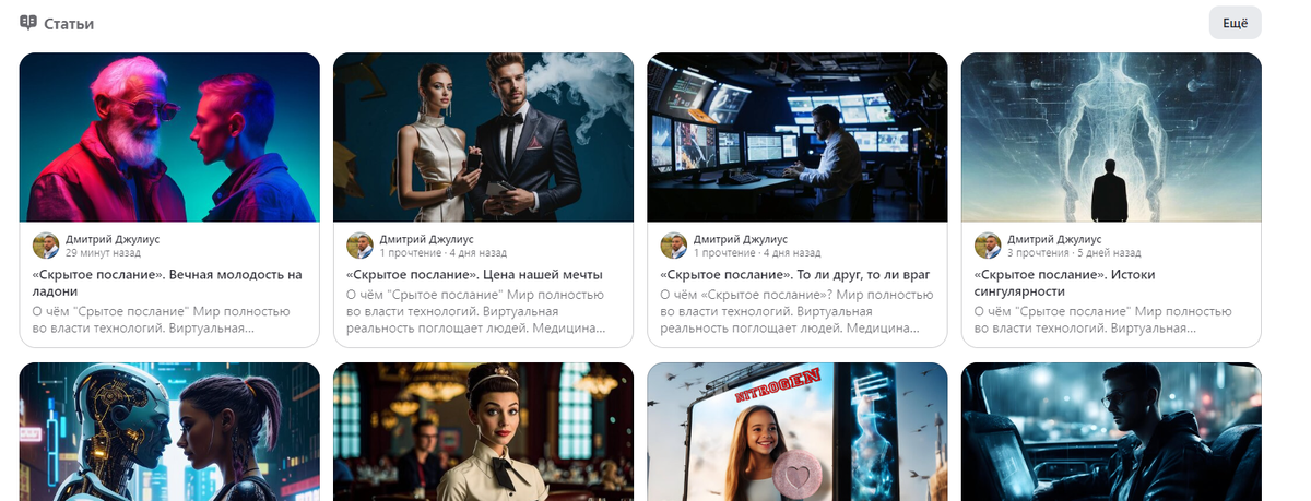 Всем привет! Я начал публикацию своего романа «Скрытое послание» на «Дзене». Главы выходят ежедневно. Это расширенная и дополненная версия 2017 года. Работаю совместно с редактором, где мы устраняем все погрешности и сюжетные неточности. Старую версию романа, что лежит в магазинах и на сайтах, прошу не читать. Впоследствии она будет удалена оттуда. Для этого я создал новый канал на Дзене имени меня Дмитрий Джулиус Прошу только поддержки (подписки) и лайков. Также приветствуются комментарии. О книге Писать я её начал в 23 года, а закончил в тридцать лет. «Скрытое послание» является переработкой моих рассказов, объединённых одной сюжетной линией. Я постарался вписать в сюжет всевозможные конспирологические теории и научные открытия на тот момент. Многие говорят, что получился детектив в стиле киберпанк. Но жанр определить сложно. Тогда это казалось фантастикой, а теперь это реальность, ворвавшаяся в нашу жизнь. Роман исследует тему внедрения ИИ в нашу жизнь, а также технологий, которые