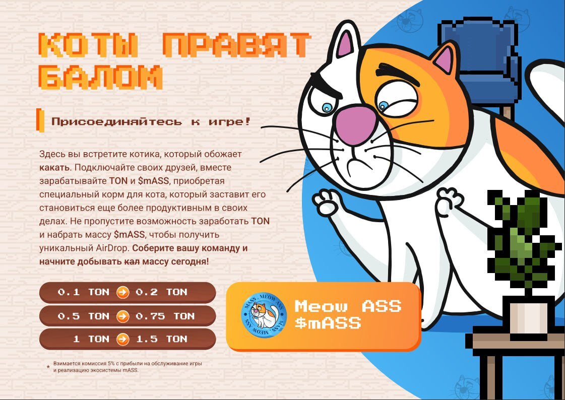 MassGameBot - Это приложение в телеграм, где мы покупая корм за TON для кота, получаем x1.5 или x2 обратно через пару часов, когда кот сделает свои дела. Выплаты приходят очень быстро, такие пирамиды могут быть опасны, но обычно в первые дни такое всегда приносит прибыль и главное заходить не более чем на 10% от всего банка, что у вас есть. Как начать играть в MassGameBot?