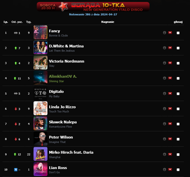 27 апреля 2024 на польском радио RM-80 вышел очередной еженедельный хит-парад исполнителей Italo Disco New Generation. По итогам этой недели ПЯТЬ песен российских проектов вошли в "Горячую десятку" NEW Italo Disco, причем ЧЕТЫРЕ из них оказались в пятерке лучших песен. Основная ДЕСЯТКА Победитель этой недели - 77 летний немецкий певец, популярный исполнитель итало-диско Fancy с песней 2024 года "Bonnie & Clyde". Российско-польский дуэт D.White & Euro Martina с песней "Let Them Be Jealous" на ВТОРОМ месте!!! Поздравляем команду Дмитрия Белого с блестящим результатом. Авторы песни Татьяна Пивоварова (Россия) и Славомир Лукашевский (Германия) в 2024 году написали песню "Пусть они завидуют", которая уже успела полюбиться слушателям. На ТРЕТЬЕМ месте - песня российского музыканта Александра Безя "Stay" в исполнении Victoria Nordmann. Исполнитель из Кургана Андрей Алимханов с песней "Shining Star" на этот раз на ЧЕТВЕРТОМ месте!!! Это еще одна песня, написанная автором из Краснодара - Алекса