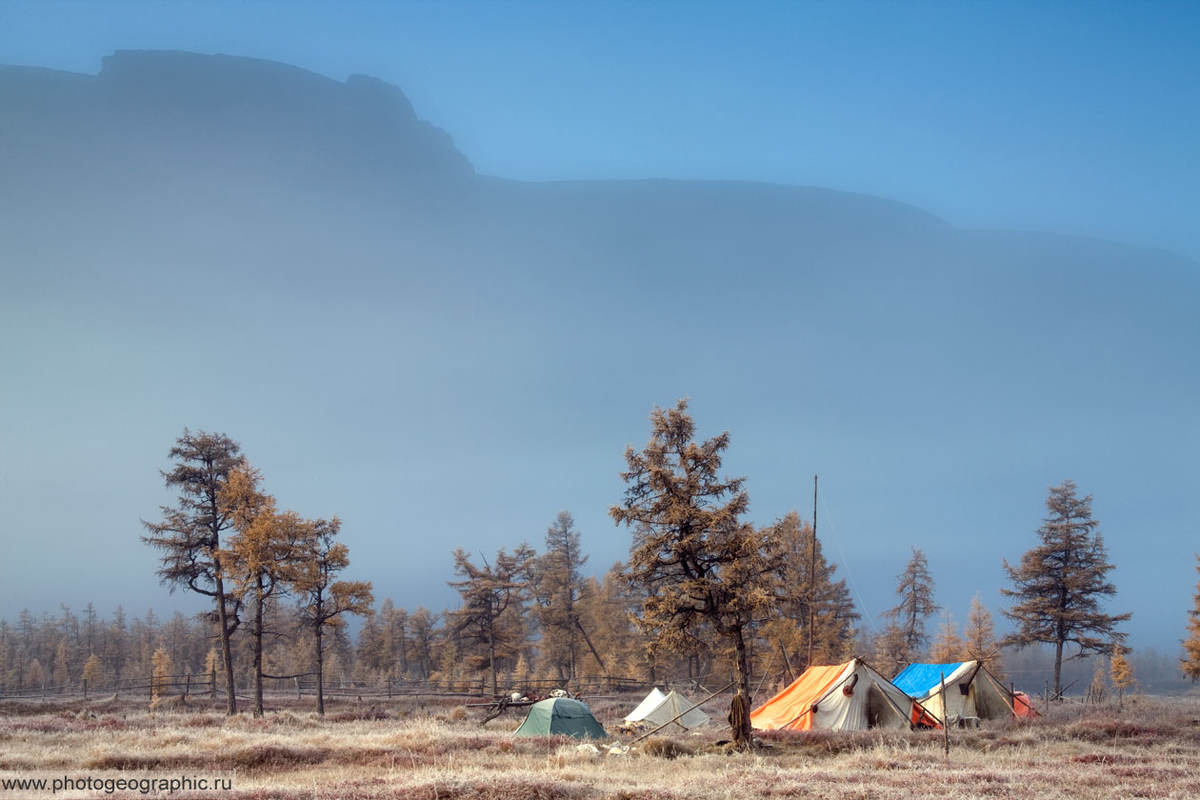 Серия - 101 день в Якутии Этап третий - хребет Черского. Золотая осень на Кенилибите входит в стадию перезрелости. Лиственницы стали коричневыми и уже начинают понемногу облетать. Такое состояние не так красиво, как было несколько дней назад, но положение компенсируют утренние состояния с туманами и изморозью. Но не каждый день одинаково щедр. Например вчера всё было пусто и невыразительно, зато сегодняшнее утро оказалось поистине прекрасным.