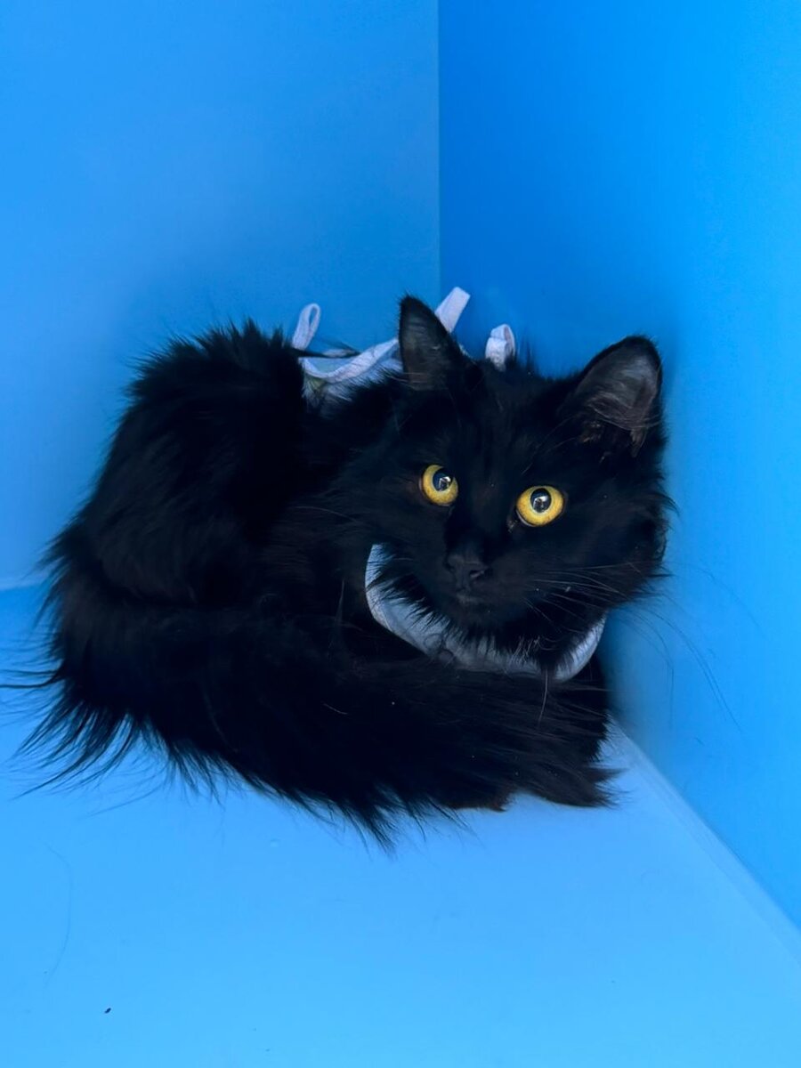 Бекки. Черная пушистая молоденькая красавица с огромными желтыми глазами ищет семью.