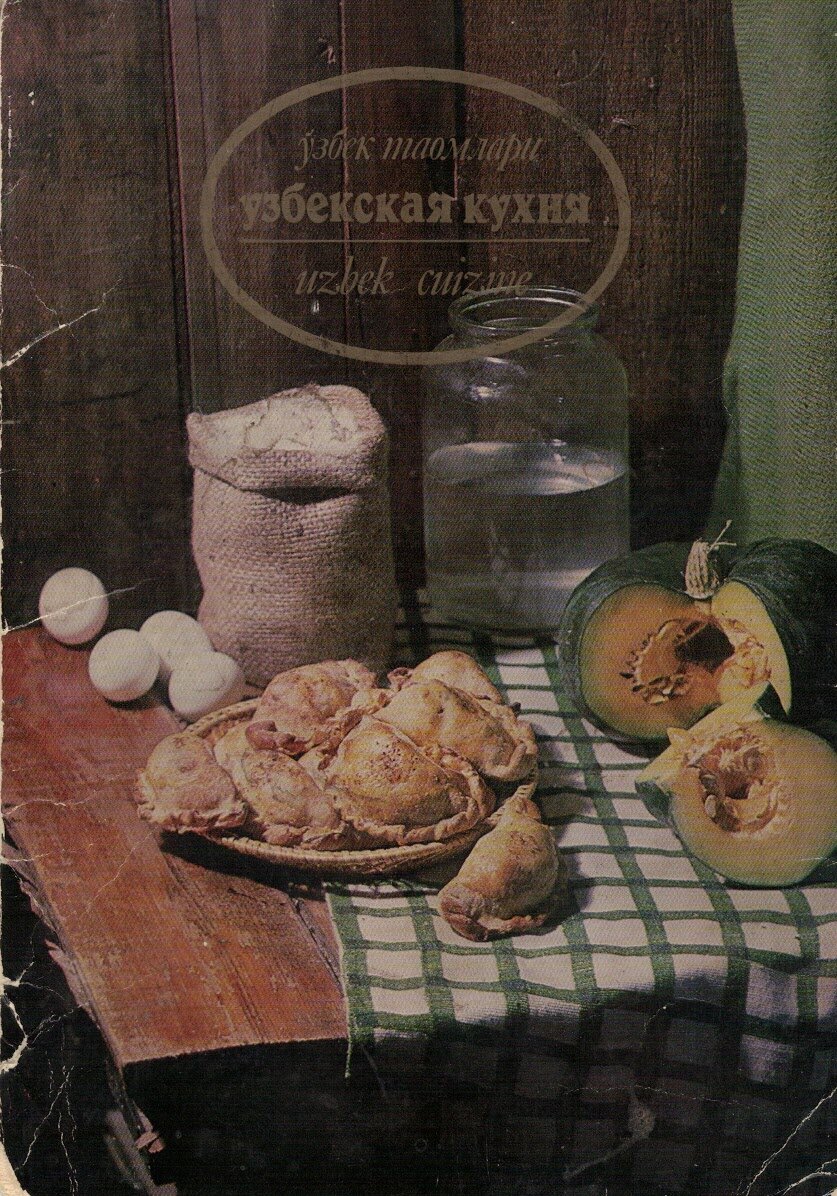 Появился у меня набор открыток, точнее скан-копия набора "Узбекская кухня" (1986). Открытки нестандартного размера более оквадраченные, чем обычные открытки, "Издательство литературы и искусства имени Гафура Гуляма", в Ташкенте. Это скорее рекламные или сувенирные открытки, и кстати здесь реально национальная кухня, а не унифицированные рецепты, или переработанные советскими технологами. Всего 16 открыток и 17 рецептов, учитывая обложку. Кстати говоря, из необычного еще представление текста рецептов сразу на 3 языках: узбекском, русском и английском. На обложке у нас изображена ошковок самса с начинкой из тыквы и нутряного жира. Следующее блюдо хасип - это колбаса с субпродуктами и мякотью баранины. Из растительных компонентов с состав входят рис и лук. Обратите внимание на логику рецепта, сначала прописано как начинять и варить колбасу, затем как делать фарш, а потом как подавать. Причем так во всех вариантах. Следующее блюдо - тыква на пару, готовится в каскане и подается смазан