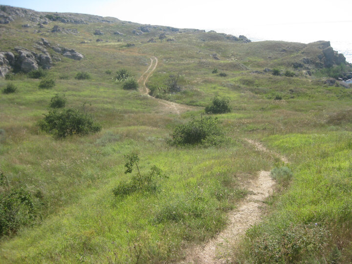Вернее, до Казантипа мы доехали, а потом пошли пешком. Сначала поднимаешься немного в гору, а потом выбираешь любую тропу, которых там куча