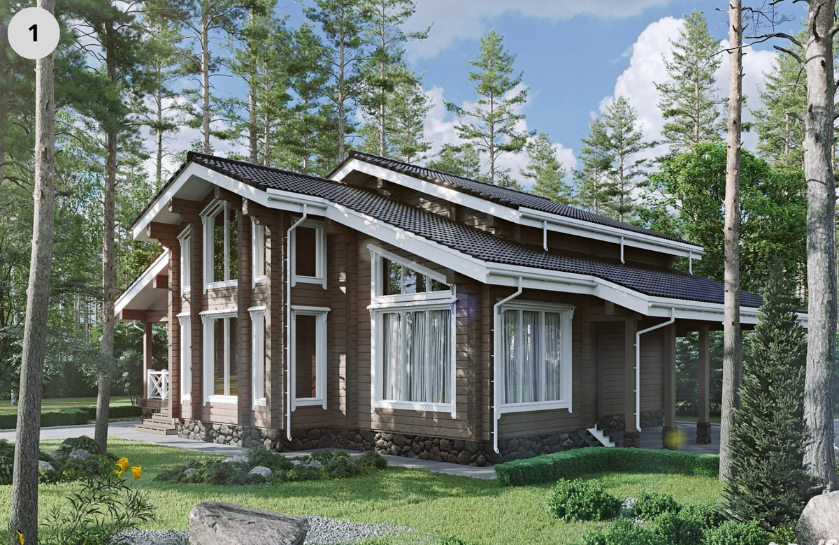 1) Двухэтажный дом с эркером, вторым светом в гостиной и верандой.