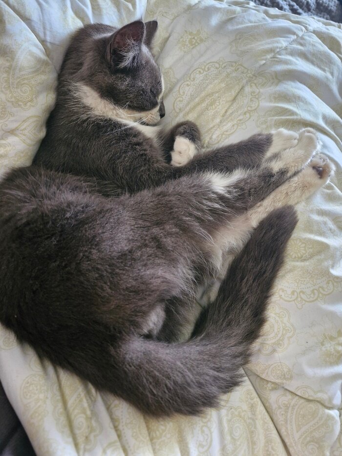Пару дней назад, вечером сидели с мужем в гостиной (1 этаж), и в какой-то момент на балконе появился котёнок. Упёрся носом в стекло, как в ужастиках, и начал мяукать. Я вынесла ему еду на балкон и закрыла штору, все же у нас дома и так кот и кошка, третьего нам брать некуда. Через 15 минут кот ломился уже в боковое окно гостиной.... Мы перешли на кухню, и через 10 минут он обнаружил нас и там, запрыгнув на сетку и начав кричать в приоткрытую форточку. Мы пошли спать, муж ушел в ванную, я была в комнате... И вдруг шлеп по подоконнику и знакомое "мяу". Я пошла к мужу, сказать, что кот обошел дом вокруг и нашел нас и в спальне, и мы решили, что все же запустим его к себе. Я вернулась, в комнату, А ОН УЖЕ ТАМ. Сидит и вылизывается. Котя отогнул сетку на окне и влез через форточку в квартиру.... Это была судьба. В итоге, уже несколько дней у нас живет умный, красивый, ласковый Мицу. Мицу - потому что на носу у него почти значок Мицубиси:) Пост автора KisiiPisii. Узнать, что думают пикабушн