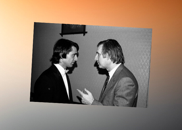 На фотографии из фондов Музея музыки мы видим композитора Альфреда Шнитке и альтиста Юрия Башмета. Снимок сделан в мае 1987 года после концерта в Большом зале Московской консерватории. В тот вечер Башмет впервые исполнил для москвичей Концерт для альта с оркестром Шнитке. Дирижировал Геннадий Рождественский. Композитор и альтист познакомились в 1976 году, когда Башмет принял участие в премьере Фортепианного квинтета Шнитке. По собственным словам, Башмет был «по уши влюблён» в музыку композитора и хотел, чтобы Шнитке написал для него большое симфоническое произведение с солирующим альтом. Таким произведением и стал Концерт для альта с оркестром. Правда, прошло девять лет, прежде чем композитор принялся за работу над произведением. Однажды Башмету позвонила жена Шнитке, Ирина Фёдоровна, и сказала: «Сел сочинять». Музыкант обрадовался и спросил, сколько времени может занять работа над концертом. Ирина Фёдоровна ответила: не более месяца. Действительно, вскоре партитура была завершена. На