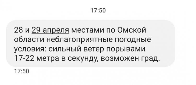 После, казалось бы, уже наступившего лета на Омск опять надвигается ненастная погода. Уже в понедельник, 29 апреля, существенно похолодает. Резкая смена температуры будет сопровождаться сильным ветром — до 22 метров в секунду и градом. Такие явления в середине весны в нашем регионе не представляют ничего неожиданного. Буквально на днях исполнилось десять лет, как по Омску пронёсся легендарный «ураган Лёня». Напомним, сильным ветром чуть не укатило шар Бухгольца, а под обломками рукнувшей остановки погибла девушка. В этот раз, надеемся, всё обойдется без столь разрушительных последствий. Неблагоприятные погодные условия будут сохраняться до 29 апреля включительно. Берегите себя!